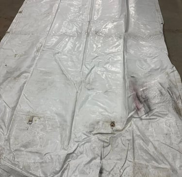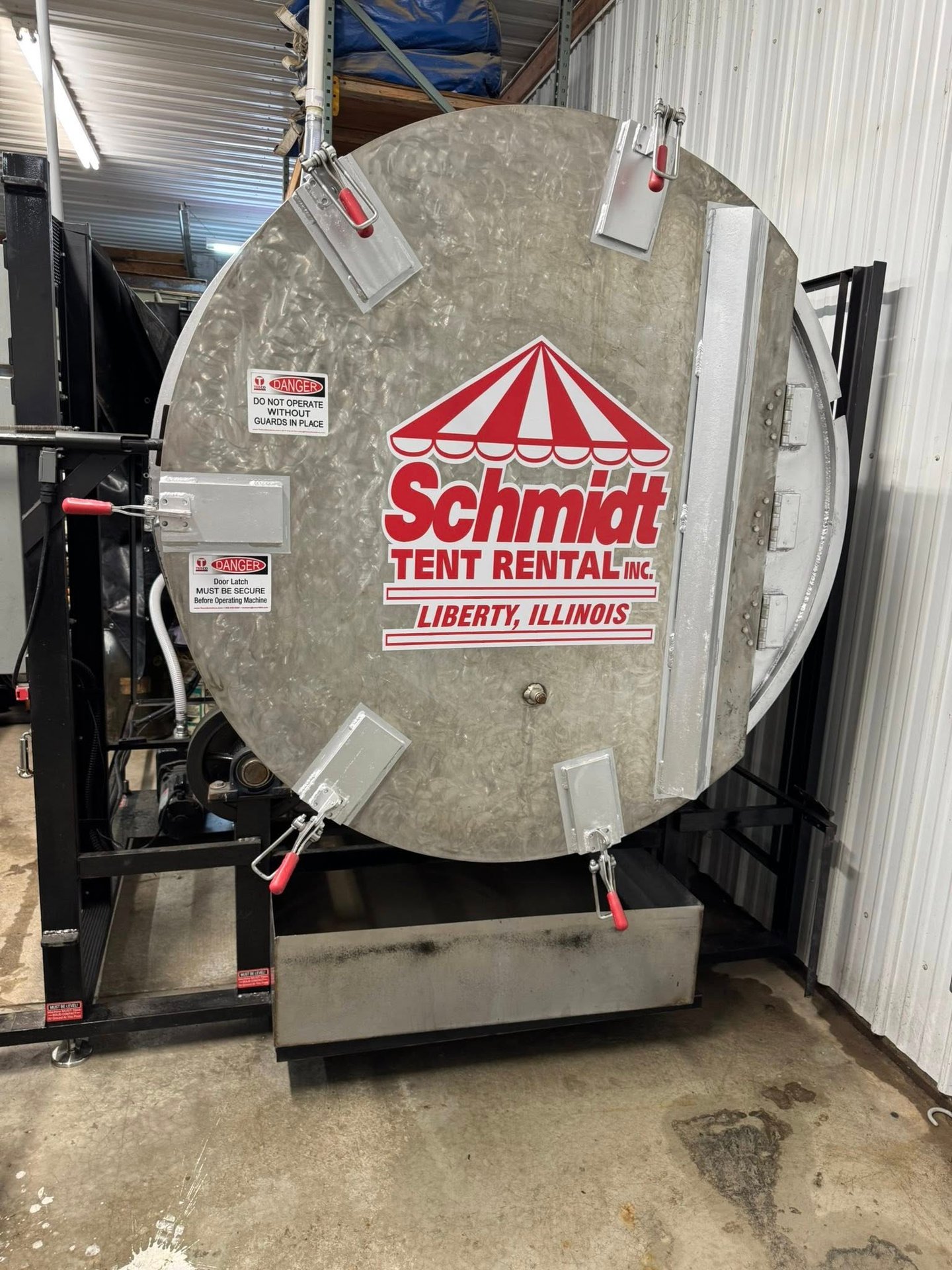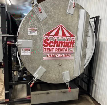 We utilize a Teeco 2200 industrial tent washer to keep our inventory clean!! This machine has a 2200 square foot washing capacity per load!!!